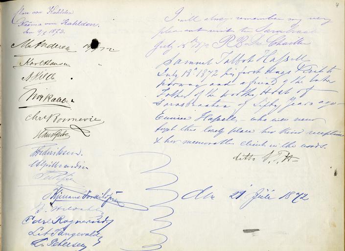 | Keywords: sarabråten østmarka gjestebok hyttebok gjester signatur signaturer navnetrekk signature thomas joh. heftye thomasjohheftye thomas johannessen heftye thomasjohannessenheftye thomas j. heftye thomasjheftye thomas heftye thomasheftye heftye document text writing drawing sketch whiteboard texture Hilsner fra bl a Du Chaillu, Paul Belloni (1835 – 1903). Amerikansk oppdagelsesreisende. Skrev bl.a. reiseskildringer fra Norge og Sarabråten. Og Samuel Talbot Hassell (1797 - 1882) Britisk adelsmann fra Yorkshir. Med kone. Hilsner fra bl a Du Chaillu, Paul Belloni (1835 – 1903). Amerikansk oppdagelsesreisende. Skrev bl.a. reiseskildringer fra Norge og Sarabråten. Og Samuel Talbot Hassell (1797 - 1882) Britisk adelsmann fra Yorkshir. Med kone. |