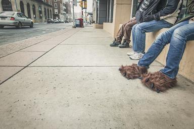 Keywords: sidewalk street city people jeans pants shoes slippers urban