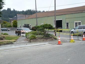 | Keywords: SidewalkConstruction.jpg en A view facing south west at the corner of Rose and Berding Streets in Ferndale California showing a curb excavation and finished poured sidewalk curbing The corner was excavated and left open and unsecured other than by caution tape for 14 days before the curbing was poured It is still open on the date of this upload own Ellin Beltz 2014-06-02 Ferndale California Sidewalks in CaliforniaPhotographs by Ellin Beltz | ||||