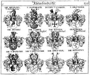 | Keywords: Siebmacher 1701-1705 E126.jpg Siebmachers Wappenbuch Tafeln der 9 Ausgabe 1701 und der 10 Ausgabe 1705 nach dem Faksimile von 1975 Tafel aus Teil 5 http //www wappenbuch com/ 1665 / between 1701 1705 Paul Fürst PD-old-100 Siebmachers Wappenbuch 1701/1705 Teil 5 Siebmacher - Ritterschaft und Adel im Rheinland Coats of arms of Büches family Coats of arms of Riedesel family Coats of arms of Hattstein family Coats of arms of Gayling von Altheim family Coats of arms of Hirschhorn family | ||||