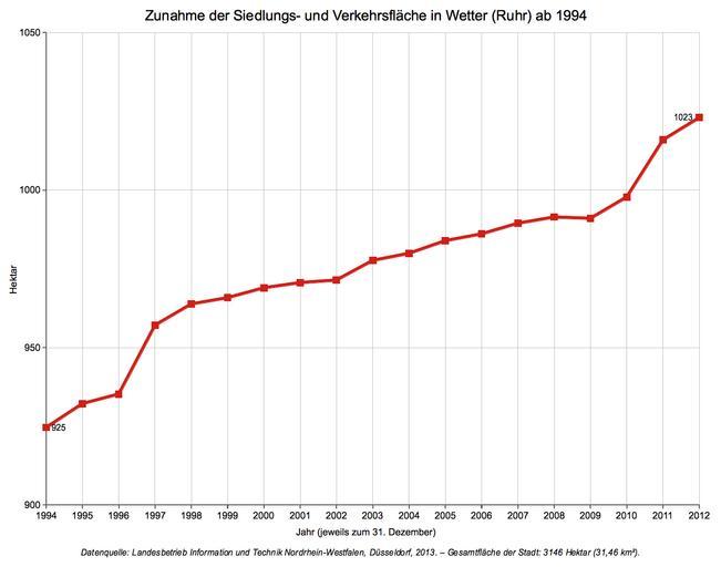| Keywords: Siedlungs- und Verkehrsfläche Wetter (Ruhr) 1994-heute.png de Zunahme der Siedlungs- und Verkehrsfläche in der deutschen Gemeinde Wetter Ruhr ab 1994 “ absolute Angabe in Hektar jeweils zum 31 Dezember der Jahre “ Die Gesamtfläche der Stadt beläuft sich seit der Gebietsreform 1970 auf 3146 Hektar 31 46 km² own <br/>Data source/Datenquelle http //www landesdatenbank nrw de landesdatenbank nrw de Landesbetrieb Information und Technik NRW DĂĽsseldorf Holger1959 2013-09-16 Files by Holger1959 Statistics of Wetter Ruhr Land use in North Rhine-Westphalia |