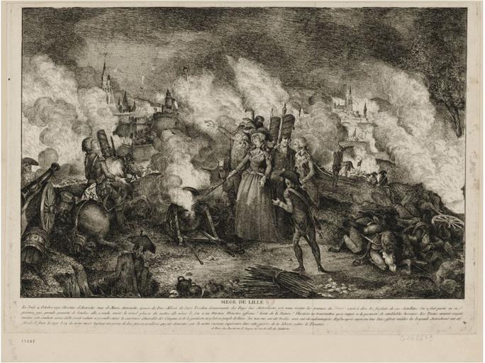 | Keywords: Siège de Lille (1792).jpg unknown 1792 Technique engraving etching Size cm 53 5 38 Institution Bibliothèque nationale de France département Estampes et photographie place of discovery object history exhibition history credit line red fr Bibliothèque nationale de France East Siège de Lille title recto bottom fr Siege of Lille Christine d'Autriche soeur de Marie Antoinette épouse du duc Albert de Saxe-Teschen gouvernante des Pays-Bas autrichiens est venu visiter les travaux du Siège c est-à-dire les forfaits de ses satellites On a fait partir en sa présence une grande quantité de bombes elle a voulu avoir le cruel plaisir de mettre elle-même le feu à un mortier Monstre affreux Honte de la nature L Histoire ne retransmettra qu à regret à la postérité de semblabes horreurs Les tyrans ennemis croyant que par cette conduite atroce Lille serait réduite en cendre mais la constance admirable des citoyens et de la garnison en a fait un peuple de héros 500 maisons ont été brulées 2 000 ont été endommagées Enfin après avoir vu tous leurs efforts inutiles les brigands autrichiens ont été forcés de lever le siège le 12 du même mois laissant une partie de leur grosse artillerie qui fut démontée par la nôtre reconnu supérieure dans cette guère de la liberté contre la Tirannie full form text recto bottom fr On 4 October 1792 Christine of Austria sister of Marie Antoinette wife of Duke Albert of Saxe Teschen governor of the Austrian Nederlands came to visit the work of the Siege that is to say the infamies of her satellites On has sent a large quantity of bombs into her presence she has wished to have the cruel pleasure of setting fire to a mortar Frightful monster Shame on nature The enemy tyrants believing that by this atrocious conduct Lille would be reduced to ashes but the admirable constancy of the Citizens and the garrison has made them a people of heroes 500 houses burned 2 000 were damaged Finally after having seen all their useless efforts the Austrian brigands were obliged to raise the siege on the 12th of the same month leaving part of their heavy artillery which was dismantled by our recognized superior in this period of freedom against Tirannie inscription Á Paris chez Basset rue St-Jacques au coin de celle des Mathurins LangSwitch name and adress of publisher nom et adresse de l imprimeur recto bottom fr Paris Basset Saint-Jacques sr treey t at the corner of Mathurins accession number RESERVE FOL-QB-201 128 place of creation ark /12148/btv1b84116689 PD-GallicaScan PD-old-100 Battles of the French Revolutionary Wars Historical images of Lille War of the First Coalition Archduchess Marie Christine Duchess of Teschen Prince Albert of Saxony Duke of Teschen |