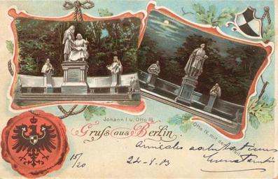 | Keywords: Siegesallee Johann Otto Otto.JPG Ehemalige Siegesallee in Berlin mit zwei Denkmalgruppen Links die Gruppe mit dem Doppelstandbild für die gemeinsam regierenden Brandenburger Markgrafen Johann I 1213 “1266 und Otto III ca 1215 “1267 Söhne von Albrecht II Die Nebenfigur Büste links zeigt den Propst Simeon von Cölln die Figur rechts Marsilius erster nachgewiesener Schultheiß von Berlin Bildhauer Max Baumbach Enthüllung 22 März 1900 Rechte Gruppe Markgraf Otto IV mit dem Pfeil ca 1238 “1308 Die Nebenfigur links zeigt den märkischen Edelmann Johann von Kröcher genannt Droiseke die Büste rechts Johann von Buch Berater und Vertreter von Johann II erlöste Otto IV aus der Gefangenschaft Bildhauer Karl Begas Enthüllung 22 März 1899 Former Siegesallee in Berlin with two monument groups On the left the group with the double-statue commemorating to the together governing margraves of Brandenburg John I 1213 “1266 and Otto III ca 1215 “1267 sons of Albert II and grandchildren of Otto II The bust on the left commemorates to the provost Simeon of Cölln on the right Marsilius de Berlin the first supported žSchultheiß german for former village mayors by documents of Berlin Sculptor Max Baumbach inaugurated 22 March 1900 On the right the group commemorating to margrave Otto IV surname with the arrow ca 1238 “1308 The bust on the left commemorates to the knight Johann von Kröcher called Droiseke on the right to Johann von Buch Sculptor Karl Begas inaugurated 22 March 1899 Postcard with date-stamp 25 August 1903 my own Lienhard Schulz and 1899 1900 Max Baumbach and Karl Begas sculptors Siegesallee 05 Johann I + Otto III Siegesallee 07 Otto IV PD-old |