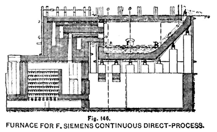 Keywords: Siemens's direct reduction continuous furnace.png Réduction directe inventé par Carl Wilhelm Siemens Le système de chauffe de ce four à réverbère est à gauche Le minerai mélangé au charbon est charge à droite Le laitier coule continuellement par un trou le métal est coulé à intervalles réguliers Carl Wilhelm Siemens The heating system of this open-hearth furnace is at the left The iron ore miwed with coal is loaded at the right The slag continuously runs by a hole the liquid steel is tapped from time to time 1890 https //archive org/details/metallurgyofstee00howerich The metallurgy of steel p 288 Henry Marion Howe 1848-1922 other versions PD-old-70-1923 Carl Wilhelm Siemens Direct reduction Images from The metallurgy of steel by H E Howe Uploaded with UploadWizard |