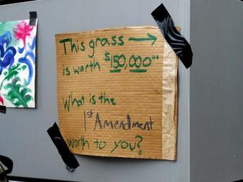 | Keywords: Sign at Occupy Boston.jpeg en Sign pointing to the former North Camp at Occupy Boston reading This grass is worth 150 000 What is the 1st Amendment worth to you 2011-10-23 own GorillaWarfare 42 35283 -71 05557 cc-zero Uploaded with UploadWizard Occupy Boston Banners and signs at demonstrations and protests |