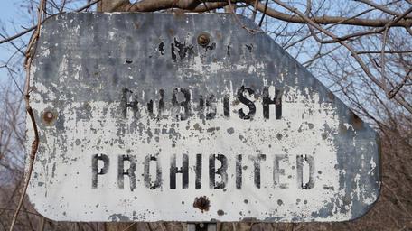 Keywords: sign warning sign old prohibited rubbish dumping attention white rusted bent outdoors announcement