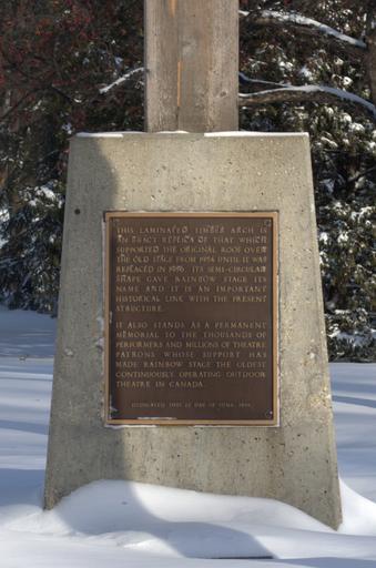 Keywords: Signage for laminated timber arch outside of Rainbow Stage in Kildonan Park (Winnipeg, Manitoba).jpg en Signage for laminated timber arch outside of Rainbow Stage in Kildonan Park Winnipeg Manitoba Text on the sign reads This laminated timber arch is an exact replica of that which supported the original roof over the old stage from 1954 until it was replaced in 1986 Its semi-circular shape gave Rainbow Stage its name and it is an important historical link with the present structure It also stands as a permanent memorial to the thousands of performers and millions of theatre patrons whose support has made Rainbow Stage the oldest continuously operating outdoor theatre in Canada Dedicated this 22 day of June 1988 2013-01-12 13 46 49 own Ccyyrree 49 941792 -97 100304 cc-zero Rainbow Stage Uploaded with UploadWizard Public art in Winnipeg Plaques in Winnipeg January 2013 in Canada 2013 in Winnipeg Winter in Winnipeg |