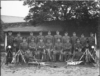 Keywords: major heath majorheath royal irish artillery royalirishartillery artillery soldiers uniforms waterford ireland munster barracks a.h. poole ahpoole arthur henri poole arthurhenripoole poole collection poolecollection glass negative glassnegative wednesday 19th september 1906 20th century 20thcentury national library of ireland nationallibraryofireland artillery barracks artillerybarracks cannon street cannonstreet blakes lane blakeslane gunner lance bombardier lancebombardier captain sergeant begbie lamp begbielamp paraffin lamp paraffinlamp signals detail signalsdetail lanyards semaphore flags heliographs blackandwhite monochrome outdoor black and white ... and their equipment. These are signal men of the Royal Irish Artillery under Major Heath in Waterford. The major may be in the photo. Photographer: Poole Photographic Studios, Waterford Date: Wednesday, 19 September 1906 NLI Ref: POOLEWP 1614a You can also view this image, and many thousands of others, on the NLI’s catalogue at catalogue.nli.ie ... and their equipment. These are signal men of the Royal Irish Artillery under Major Heath in Waterford. The major may be in the photo. Photographer: Poole Photographic Studios, Waterford Date: Wednesday, 19 September 1906 NLI Ref: POOLEWP 1614a You can also view this image, and many thousands of others, on the NLI’s catalogue at catalogue.nli.ie ... and their equipment. These are signal men of the Royal Irish Artillery under Major Heath in Waterford. The major may be in the photo.