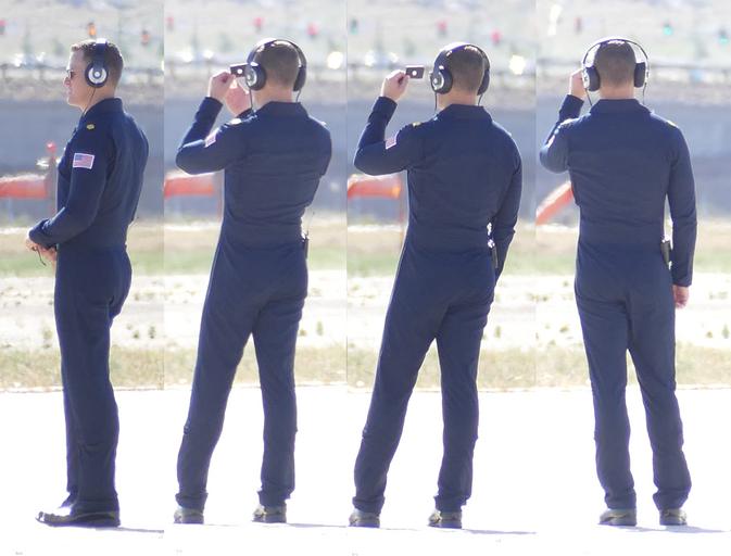 | Keywords: signal mirror signalmirror thunderbird 9 thunderbird9 thunderbirds usaf thunderbirds usafthunderbirds airshow outdoor Here's a composite view of Thunderbird 9 tracking Thunderbird 1 with a signal mirror, facing away from the audience. Maj. (Dr.) Chris Scheibler, Thunderbird 9, using a signal mirror to mark show center for Thunderbird 1 during the USAF Thunderbirds' aerial performance at the "Thunder over the Empire" airshow at March Air Reserve Base in Riverside County, CA on April 17, 2016. Step 1: Reflect mirror light on other hand (this lets Thunderbird 9 locate the "fireball" aiming aid). Step 2: Using the mirror. Step 3: Waiting for the next pass. I'm releasing this photo to the public domain under the CC0 license. If you want to reuse it, you may want to start with the full resolution version, here. Here's a composite view of Thunderbird 9 tracking Thunderbird 1 with a signal mirror, facing away from the audience. Maj. (Dr.) Chris Scheibler, Thunderbird 9, using a signal mirror to mark show center for Thunderbird 1 during the USAF Thunderbirds' aerial performance at the "Thunder over the Empire" airshow at March Air Reserve Base in Riverside County, CA on April 17, 2016. Step 1: Reflect mirror light on other hand (this lets Thunderbird 9 locate the "fireball" aiming aid). Step 2: Using the mirror. Step 3: Waiting for the next pass. I'm releasing this photo to the public domain under the CC0 license. If you want to reuse it, you may want to start with the full resolution version, here. |