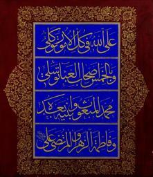 | Keywords: Signed Mahmud Celaleddin - Levha (calligraphic inscription) - Google Art Project (591903).jpg Arabic text reads على الله في كل الأمور توكلى وبالخمس أصحاب العباء توسلى محمد المبعوث وابنيه بعده وفاطمة الزهراء والمرتضى على 1750 Signed 591902 Mahmud Celaleddin 1750 /collection/sakp-sabanc-museum/artwork/levha-calligraphic-inscription-signed-mahmud-celaleddin/591903/ Signed Mahmud Celaleddin /artist/mahmud-celaleddin/4126481/ 4126481 /collection/sakp-sabanc-museum/ Sakıp Sabancı Museum 479109 http //muze sabanciuniv edu/ 12/28/2011 6 21 37 PM /collection/sakp-sabanc-museum/artwork/levha-calligraphic-inscription-signed-mahmud-celaleddin/591903/ 1800 1800 635 591903 False 1800 3/24/2012 6 39 50 AM 130-0100-MC Sakıp Sabancı Museum Gold on paper 1800 1810 w550 x h635 mm 1800 False 0 861328125 Sakıp Sabancı Museum Object levha-calligraphic-inscription-signed-mahmud-celaleddin Levha calligraphic inscription l 550 special url_id dgGsk_3htnjtEw PD-old-100 Google Art Project works by Mahmud Celaleddin Calligraphy in Turkey |
