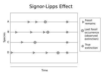 Keywords: Signor-lipps.svg The Signor-Lipps effect can reduce the apparent severity of a catastrophic extinction by making it appear extended in time Own 2008-03-29 Grady Weyenberg Image Signor-lipps png Extinction Evolutionary biology