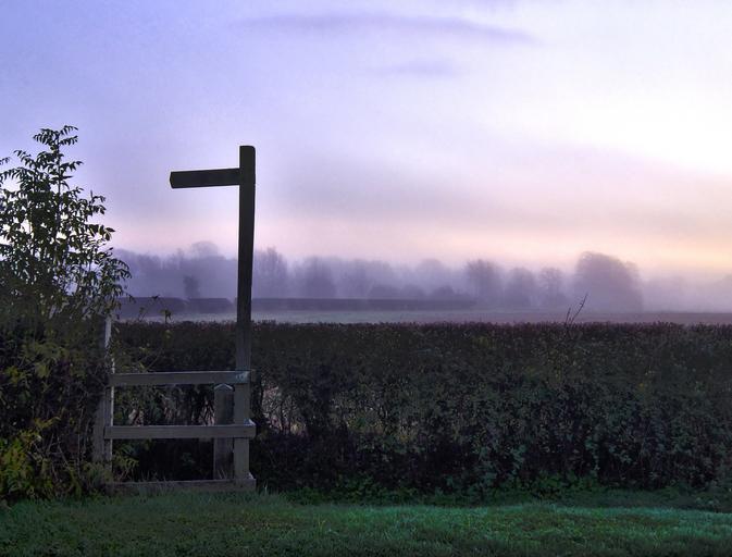 Keywords: signpost dawn morning misty mist nature countryside wooden sign stile rural hedge fields trees autumn sunrise