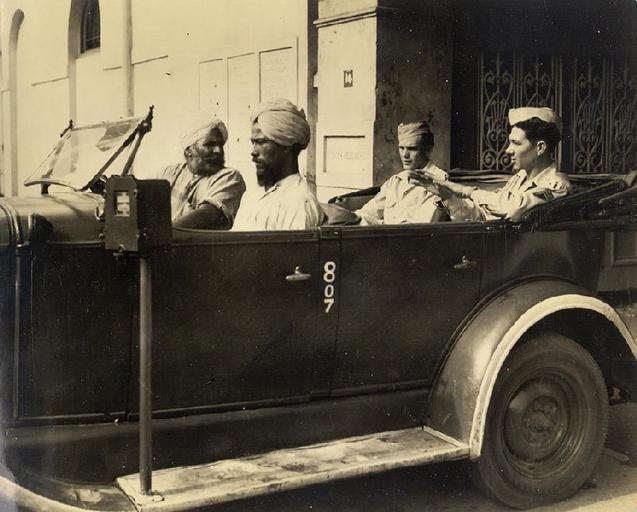 | Keywords: Sikh taxi-driver and co-pilot with American GIs in Calcutta in 1945.jpg Of Calcutta's assortment of colorful and intriguing characters the sikh taxi-driver and his co-pilot rank high The co-pilot was added in 1944 following an affray in which a soldier knifed a driver The two GI's shown here are doing their best to convey their destination to the driver of the ancient jalopy The South Asia Section of the Van Pelt Library University of Pennsylvania recently acquired from a bookdealer a photograph album consisting of 60 photographs of Calcutta taken most likely between 1945-1946 The photographer Mr Clyde Waddell also provided the interesting glosses accompanying each photograph Several attested copies of this work has emerged including one with a 'title page' held by the Southeastern Louisiana University in Hammond Louisiana Mr Waddell was a military photographer Many of his captions sound like annotations that would be found in a typical military magazine The album begins with several general long shots of Calcutta and ends with a picture of dhobi-s washermen washing clothes The text accompanying the last photograph also sounds as if the author intended to finish with that picture of one of the great mysteries of India The annotations have been included because of their intrinsic interest not only to the photographs but to a 'typical' American impression of India at this time 1945 http //www library upenn edu/collections/sasia/calcutta1947/ Clyde Waddell other versions PD-USGov Van Pelt Library University of Pennsylvania - Clyde Waddell Calcutta 1940's photos Uploaded with UploadWizard Sikh men from India |