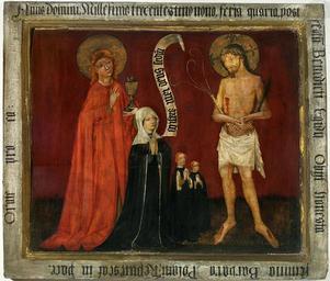 | Keywords: Silesia Epitaph of Barbara Polani.jpg Silesia ca 1409 1613 tempera lime cm 74 84 5 Institution National Museum Warsaw 0 accession number Śr 27 object history ca 1613 transfer St Barbara's Church Wrocław ProvenanceEvent 1946 transfer National Museum in Warsaw credit line L miserere mei deus secundum magnam misericordiam / Anno domini Millesimo trecentesimo nono feria quarta post festum Benedicti Egidij Obijt Honesta femina Barbara Polani Requiescat in pace Orate pro ea caption frame Barbara Polani and her daughteres being introduced by St John the Evangelist to the Christ depicted as Man of Sorrows In 1613 Christoph Poley von Thiergarten the Wrocław Councillor established a new frame From St Barbara's Church in Wrocław today Orthodox Church Muzeum Narodowe w Warszawie 1969 Annuaire du Musée national de Varsovie Vol 13 ed 1 p 32 ed Adam S Labuda Krystyna Secomska 2004 Malarstwo gotyckie w Polsce Wydawn DiG ISBN 83-71813-50-3 cat no 280 own See below PD-old-100 ImageNote 1 462 140 78 275 1000 851 2 miserere mei deus secundum ImageNoteEnd 1 DEFAULTSORT 1409 circa; Epitaph of Barbara Polani 15th-century paintings in the National Museum in Warsaw Medieval paintings in the National Museum in Warsaw Silesian paintings in the National Museum in Warsaw Paintings of the Man of Sorrows in Poland gothic paintings of the Man of Sorrows Donor portraits with the Passions Orthodox Cathedral of the Nativity of the Virgin Mary in Wrocław |