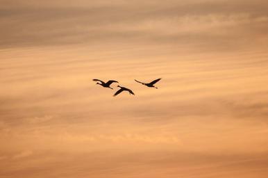 Keywords: silhouette crane flying birds clouds sky sunset high