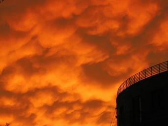 Keywords: silo orange sky sunset dusk urban eerie spooky clouds shadows evening color sunlight twilight dramatic outdoor weather nature