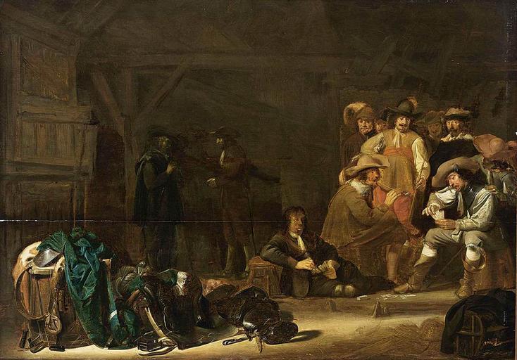 | Keywords: Simon Kick - Soldiers in a Barn - WGA12186.jpg  Artwork Creator Simon Kick other date firsthalf other date century 17 Oil on panel size cm 75 105 Private collection accession number object history credit line WGA link 12186 http //www wga hu/art/k/kick/simon/soldiers jpg http //www wga hu/html/k/kick/simon/soldiers html PD-old-100 painting genre Dutch 1601-1650 Simon Kick Paintings in unidentified private collections 17th-century oil on canvas paintings WGA form painting WGA type genre WGA School Dutch WGA time period 1601-1650 17th-century way of life in painting 17th-century military life Interiors of barns in art 1601-1650 paintings in private collections Card games in art Men in rooms in art |