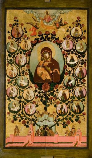 | Keywords: Simon Ushakov - Древо государства Московского (Похвала Богоматери Владимирской) - Google Art Project.jpg Artwork Q18689355 Creator Simon Ushakov Внизу на изоб ажении к емлевской стены в с еднике надпись с датой; сп ава в нижнем углу авто ская подпись А писал сии об азъ его госуда евъ зог афъ Пимин зовомый Симон Ушаковъ а фоне Успенского собо а изоб ажены пе вый московский мит ополит Пет и князь Иван Данилович Калита Они сажают и поливают де ево кото ое как бы п о астает сквозь Успенский собо заполняя ветвями всю пове хность иконы а ветвях д ева медальоны с изоб ажением московских святых а в цент альном самом большом медальоне об аз Богомате и Владими ской За к емлевской стеной стоят ца ь Алексей ихайлович и его пе вая жена а ия Ильинична у ожденная илославская с детьми аве ху в облаках Спас в учающий па ящим ангелам венец и изу для Алексея ихайловича ца ь небесный венчает ца я земного Изоб ажения святых в медальонах асполагаются снизу вве х с некото ыми отступлениями от исто ической последовательности как бы сооб азуясь с « остом» де ева а левой ветви за мит ополитом Пет ом п едставлены отцы усской це кви мит ополиты Алексий Кип иан Иона Фотий и Филипп пат иа хи Иов и Фила ет ца и ихаил Федо ович Феодо Иоаннович ца евич Дмит ий а п авой ветви в пе вом медальоне изоб ажен дед Ивана Даниловича Калиты князь Александ евский в одежде схимника За ним основатели и настоятели близких к оскве монасты ей п еподобный икон Радонежский п еподобный Се гий Радонежский п еподобный Савва Сто ожевский п еподобный Пафнутий Бо овский п еподобный Симон безмолвник п еподобный Анд оник и московские блаженные аксим Василий Иоанн Большой колпак 1668 Tempera wood cm 105 62 Institution Tretyakov Gallery 62 object history credit line accession number 0QHfXsSs8WM9ug PD-old-100 http //www tretyakovgallery ru/ru/collection/_show/image/_id/2610 Google Art Project works in The State Tretyakov Gallery Tree of Moscow Tsardom Ushakov ImageNote 1 281 3179 261 280 2338 4000 2 Алексей ихайлович ImageNoteEnd 1 ImageNote 2 1637 3159 321 294 2338 4000 2 а ия Ильинична илославская с детьми Алексеем и Федо ом ImageNoteEnd 2 ImageNote 3 935 3192 461 254 2338 4000 2 пе вый московский мит ополит Пет <br>и князь Иван Данилович Калита ImageNoteEnd 3 ImageNote 4 180 2558 367 301 2338 4000 2 ит ополит Кип иан ImageNoteEnd 4 ImageNote 5 581 2297 301 200 2338 4000 2 ит ополит Иона ImageNoteEnd 5 ImageNote 6 187 2210 281 274 2338 4000 2 Фотий ImageNoteEnd 6 ImageNote 7 468 1963 261 260 2338 4000 2 Филипп ImageNoteEnd 7 ImageNote 8 641 2638 281 267 2338 4000 2 ит ополит Алексий ImageNoteEnd 8 ImageNote 9 187 1683 281 307 2338 4000 2 Пат иа х Иов ImageNoteEnd 9 ImageNote 10 407 1396 281 274 2338 4000 2 Пат иа х Фила ет ImageNoteEnd 10 ImageNote 11 174 1062 274 254 2338 4000 2 ца ь ихаил Федо ович ImageNoteEnd 11 ImageNote 12 534 1015 267 274 2338 4000 2 Ца ь Федо Иоаннович ImageNoteEnd 12 ImageNote 13 274 688 321 307 2338 4000 2 Св Ца евич Дмит ий ImageNoteEnd 13 ImageNote 14 1423 2624 307 314 2338 4000 2 князь Александ евский в одежде схимника ImageNoteEnd 14 ImageNote 15 1844 2604 274 274 2338 4000 2 п еподобный икон Радонежский ImageNoteEnd 15 ImageNote 16 1490 2270 247 294 2338 4000 2 п еподобный Се гий Радонежский ImageNoteEnd 16 ImageNote 17 1884 2217 294 314 2338 4000 2 п еподобный Савва Сто ожевский ImageNoteEnd 17 ImageNote 18 1623 1937 307 314 2338 4000 2 п еподобный Пафнутий Бо овский ImageNoteEnd 18 ImageNote 19 1937 1683 247 327 2338 4000 2 п еподобный Симон безмолвник ImageNoteEnd 19 ImageNote 20 1677 1382 307 301 2338 4000 2 п еподобный Анд оник ImageNoteEnd 20 ImageNote 21 1516 988 354 321 2338 4000 2 Василий Блаженный ImageNoteEnd 21 ImageNote 22 1944 1075 261 274 2338 4000 2 аксим Блаженный ImageNoteEnd 22 ImageNote 23 1797 681 287 280 2338 4000 2 Иоанн Большой колпак ImageNoteEnd 23 Google Art Project works by Simon Ushakov |
