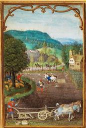 | Keywords: Simonbening.jpg This is a double-sided leaf illustrating typical occupations for August/September and September /October It is probably from a series of the Twelve Months The side reproduced here features an exquisitely detailed scene showing peasants sowing and ploughing It represents September or October Miniatures were first painted to decorate and illustrate hand-written books From the 1460s onwards there was competition from printed books However wealthy patrons continued to provide a market for beautifully produced books or independent miniatures including scenes like those painted by Simon Bening Watercolour vellum cm 9 5 14 no E 4576-1910 Victoria and Albert Museum http //www vam ac uk/content/articles/t/origin-of-portrait-miniature/ 1540 Creator Simon Bening PD-art-100 Simon Bening Medieval objects in the Victoria Albert Museum Paintings of autumn 1540s paintings in the United Kingdom 16th-century watercolor paintings 16th-century illuminated manuscripts Books of Hours Peasants in the 16th century Farming in medieval miniature |