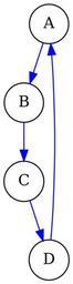 | Keywords: Simple directed graph.svg de Gerichteter graph ohne mehrfachkanten en Directed graph without multiple edges own Ksd5 2013-08-04 Raster version superseded Graphviz source <source lang dot > digraph simple edge color blue; node shape circle fontname serif ; A -> B -> C -> D -> A; </source> Directed graphs Cycle graph 4 Images with Graphviz source code User Ksd5/Licensing |