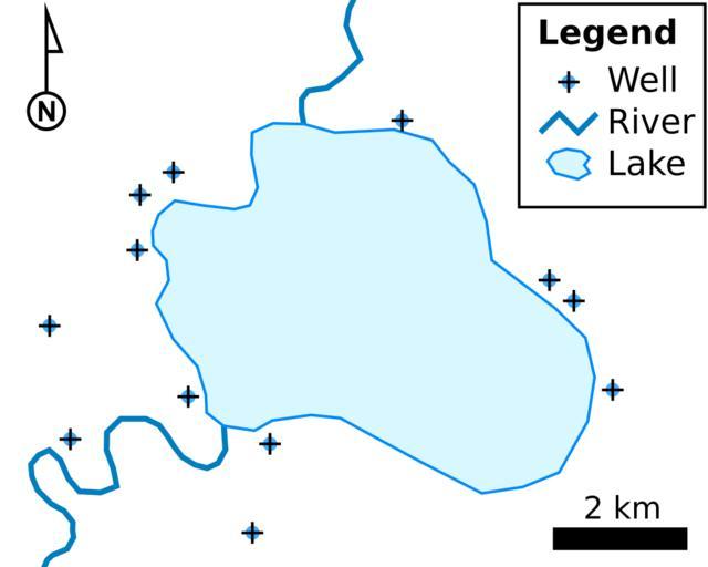 Keywords: Simple vector map.svg en A simple vector map with points wells polylines rivers and polygons lake 2007-11-05 own assumed Mwtoews Geographic information systems Symbols on maps SVG diagrams in English SVG diagrams