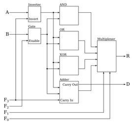 | Keywords: Simplified-ALU.svg de Einfache ALU 2013-02-08 10 24 48 own Miessen wikitable ---- F<sub>3<sub/> F<sub>2<sub/> F<sub>1<sub/> F<sub>0<sub/> R - 0 0 0 1 0 - 0 0 0 0 A - 1 0 0 1 NOT A - 0 1 0 0 A AND B - 0 1 0 1 A OR B - 0 1 1 0 A XOR B - 0 1 1 1 A + B - 1 1 1 1 B - A - Inkscape cc-zero Uploaded with UploadWizard Arithmetic logic units |