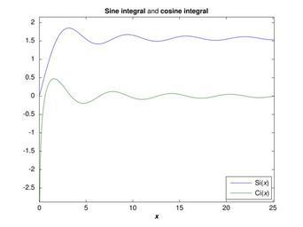 | Keywords: Sine cosine integral.svg sine integral and cosine integral functions for <math>0 < x \le 8\pi</math> The plot was produced by the following MATLAB code <source lang matlab > x 0 0 01 pi 8 pi; Si sinint x ; Ci cosint x ; requires Symbolix Math Toolbox plot x Si x Ci ; margin 0 3; axis min x max x min min Si min Ci max max Si max Ci + margin title ' \bfSine integral and \bfcosine integral ' ; legend 'Si \itx ' 'Ci \itx ' 'Location' 'SouthEast' xlabel ' \it \bfx ' </source> The plot was converted to SVG using the http //www mathworks com/matlabcentral/fileexchange/7401 plot2svg function from MATLAB Central Own DmitTrix 2009-03-31 Check categories 2009 April 1 en wikipedia Trigonometric_integral 4 Integral functions |
