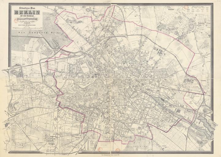| Keywords: Sineck Situations-Plan von Berlin 1889.jpg LargeImage InteractiveViewer Unter dem Plan steht Neu vollständig berichtigte Ausgabe von 1889 Es sind im Gegensatz zu weiteren Pländen derselben Serie keine Planungen in Rot eingetragen Die erste Ausgabe dieser Planserie erschien 1866 Sineck T 1889 Bibliothèque nationale de France - Gallica http //gallica bnf fr/ark /12148/btv1b530249961 btv1b530249961 map date Berlin wikidata location Q64 10000 N de print date Bibliothèque nationale de France - Gallica accession number btv1b530249961 Size cm 136 0 101 5 Size cm 132 0 96 5 map size lithograph Literatur G Schulz Die Stadtpläne von Berlin 1652-1920 Nr 981 other versions <gallery> Sineck Situations-Plan von Berlin 1882 jpg 1882 Sineck Situations-Plan von Berlin 1889 jpg 1889 Sineck Situations-Plan von Berlin 1891 jpg 1891 Sineck Situations-Plan von Berlin 1905 jpg 1905 </gallery> PD-old-70-1923 1889 in Berlin Old maps of Berlin 1889 |
