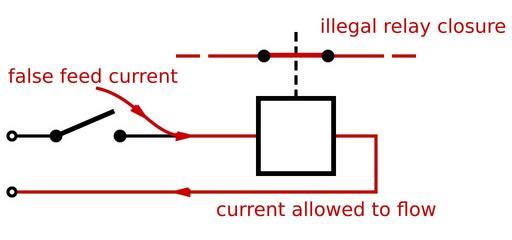 Keywords: Single switching.svg en A diagram showing a single switched relay allowing current to flow and the relay to close when a false feed current is somehow introduced Own Inductiveload 2009-01-25 Relay circuits Rail transport safety