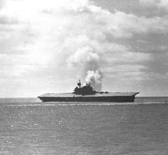 | Keywords: Sinking of the USS Yorktown (CV-5) 02.jpg The U S aircraft carrier USS Yorktown CV-5 damaged the Battle of Midway 4 June 1942 The Yorktown lists heavily to the port side with smoke billowing from her funnel after an attack by Japanese aircraft during which she sustained three bomb hits and two torpedo hits On 6 June 1942 the Japanese submarine I-168 scored another two torpedo hits on the crippled aircraft carrier and she sank on 7 June Destroyers spent an entire day seeking out the Japanese submarine that sunk the Yorktown and her escort destroyer USS Hammann DD-412 but failed to sink I-168 The submarine was finally sunk by the USS Scamp SS-277 on 27 July 1943 U S Navy photo http //www history navy mil/our-collections/photography/wars-and-events/world-war-ii/midway/80-G-17062 html 80-G-17062; National Museum of Naval Aviation photo No 2003 001 223 http //collections naval aviation museum/emuwebdoncoms/pages/common/imagedisplay php irn 4629 reftable ecatalogue refirn 3096 1942-06-04 U S Navy PD-USGov-Military-Navy Battle of Midway US forces USS Yorktown CV-5 |
