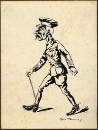 | Keywords: university of victoria universityofvictoria uvic great britain. army. royal regiment of artillery greatbritainarmyroyalregimentofartillery caricatures and cartoons--20th century caricaturesandcartoons20thcentury notebooks war artists warartists world war, 1914-1918--pictorial works worldwar19141918pictorialworks world war, 1914-1918--caricatures and cartoons worldwar19141918caricaturesandcartoons drawing sketch text photo border outdoor illustration Item is one of 123 pen-and-ink drawings and watercolours from two volumes titled: "Sketches of the War: France/Belgium". The sketches vary from satirical cartoons to more detailed and naturalistic renditions. They are often accompanied by an ironic title and are often signed with the artist's initials, "J.M." The artist's satirical targets include the officers and high command of both combatant sides; the disjuncture between reported and actual events, and the death of civilians as a fact of modern warfare. Item is one of 123 pen-and-ink drawings and watercolours from two volumes titled: "Sketches of the War: France/Belgium". The sketches vary from satirical cartoons to more detailed and naturalistic renditions. They are often accompanied by an ironic title and are often signed with the artist's initials, "J.M." The artist's satirical targets include the officers and high command of both combatant sides; the disjuncture between reported and actual events, and the death of civilians as a fact of modern warfare. |