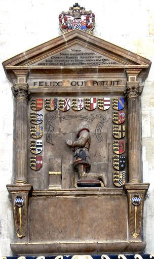 | Keywords: SirPeterCarew Died1575 ExeterCathedral.PNG  en Heavily restored mural monument to Sir Peter Carew d 1575 of Mohuns Ottery Luppitt Devon Exeter Cathedral south transept A series of 16 escutcheons are shown above and to the sides of the kneeling effigy of Sir Peter Carew These all show the arms of Carew Or three lions passant guardant in pale sable impaling arms of various wives clockwise from lower left Left side Gules four fusils in fess ermine Dinham Argent a fess between three boars sable Huddesfield Courtenay quartering Redvers Earls of Devon Pollard Top Berry Party per pale or and azure overall a lion rampant gules Alternatively assuming sinister half vert not azure Party per pale or and vert overall a lion rampant gules William Marshal 1st Earl of Pembroke 1146/7-1219 into which family the Mohuns married Per pale gules and ermine a cross saltire counterchanged Argent three eaglets displayed gules de Courcy Quarterly argent and gules Alternatively if Quarterly or and gules de Mandeville which family held the manor of Ottery Mohuns Ottery Argent two bars gules Martin/FitzMartin Azure a bend or Carminow here shown with a label of three points gules Right side Quarterly 1 4 Gules a manche ermine the hand argent holding a fleur-de-lis or Mohun of Ottery ; 2nd Vair a chief chequy or and gules Fleming of Bratton Fleming per Pole and possibly Fleming of Stoke Fleming and Mohuns Ottery ; 3rd Gules two bends wavy or Brewer Reginald I de Mohun 1185-1213 in 1205 married Alice Brewer 4th sister and co-heiress of William Brewer feudal baron of Horsley Derbyshire and of lord of the manor of Torr Brewer later Torr Mohun now Torquay in Devon Or a cross engrailled sable Mohun of Dunster Gules a lion rampant or FitzAlan here shown apparently within a bordure or Sable six mullets argent pierced gules Bonville Quarterly of 4 1 4 Or three torteaux Courtenay of Haccombe ; 2 Argent three chevronels sable Archdekne of Haccombe ; 3 Argent three bendlets sable The arms Or a fess vair between two lions passant guardant sable shown on the two lowest escutcheons either side at the base of the two flanking columns are those of the historian John Hooker d 1601 alias Vowell a distinguished citizen of Exeter who became Sir Peter's confidential adviser and agent and subsequently his biographer Hamilton-Rogers William Henry Memorials of the West Historical and Descriptive Collected on the Borderland of Somerset Dorset and Devon Exeter 1888 chapter The Nest of Carew Ottery-Mohun p 808 own photo Lobsterthermidor <span class signature-talk ></span> 13 42 20 February 2015 UTC 2013 Memorials in Exeter Cathedral Wall mounted church monuments in Devon Carew arms Bonville arms Courtenay arms Pollard arms Huddesfield arms Dinham arms De Courcy arms Mohun arms FitzAlan arms Hooker alias Vowell arms Fleming arms Carminow arms Archdekne arms Brewer arms |