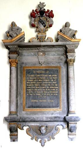 Keywords: SirRobertCary Died1675 ClovellyChurch Devon.PNG en Mural monument to Sir Robert Cary 1610-1675 of Clovelly Devon All Saints Church Clovelly Inscription In memory of S<sup>r</sup> Robert Cary K<sup>t</sup> sonne and heyre of William Gentleman of the Privy Chamber unto King Charles the 2<sup>d</sup> who having served faithfully that glorious prince Charles the I<sup>st</sup> in the long Civil Warr against his rebellious subjects and both him and his sonne as a Justice of Peace he dyed a batchelour in the 65 yeare of his age An Dom 1675 Peritura Perituris Reliqui I have left behind those things destined to perish with those people destined to perish A reference to Seneca On Providence L ANNAEI SENECAE DIALOGORVM LIBER I AD LVCILIVM QVARE ALIQVA INCOMMODA BONIS VIRIS ACCIDANT CVM PROVIDENTIA SIT DE PROVIDENTIA V 7http //www thelatinlibrary com/sen/sen prov shtml Fata nos ducunt et quantum cuique temporis restat prima nascentium hora disposuit Causa pendet ex causa privata ac publica longus ordo rerum trahit ideo fortiter omne patiendum est quia non ut putamus incidunt cuncta sed veniunt Olim constitutum est quid gaudeas quid fleas et quamvis magna videatur varietate singulorum vita distingui summa in unum venit accipimus peritura perituri we receive what is perishable and shall ourselves perish literally we who are about to perish receive things about to perish ; We accept that we destined ourselves to perish live amongst things also destined to perish see works of Robert Leighton Archbishop of Glasgow Seneca's text translated as https //archive org/stream/moralessayswithe01seneuoft/moralessayswithe01seneuoft_djvu txt Therefore everything should be endured with fortitude since things do not as we suppose simply happen ” they all come Long ago it was determined what would make you rejoice what would make you weep and although the lives of individuals seem to be marked by great dissimilarity yet is the end one ” we receive what is perishable and shall ourselves perish Why therefore do we chafe why complain For this were we born Let Nature deal with matter which is her own as she pleases ; let us be cheerful and brave in the face of everything reflecting that it is nothing of our own that perishes Above are shown the arms of Cary Argent on a bend sable three roses of the field own photo Lobsterthermidor <span class signature-talk ></span> 14 18 10 February 2015 UTC 2014 All Saints Church Clovelly interior Wall mounted church monuments in Devon Cary arms |