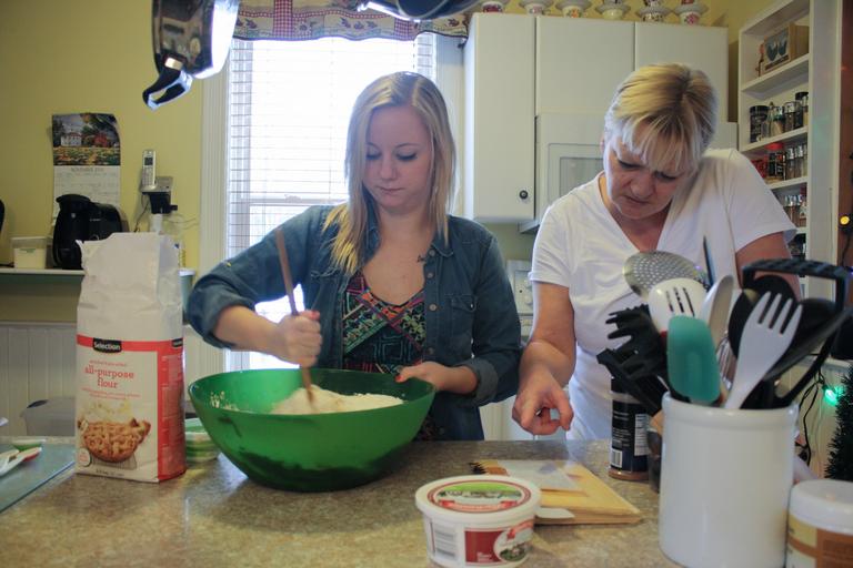 Keywords: sister girl baking bake stir mix family christmas mother daughter teacher tradition