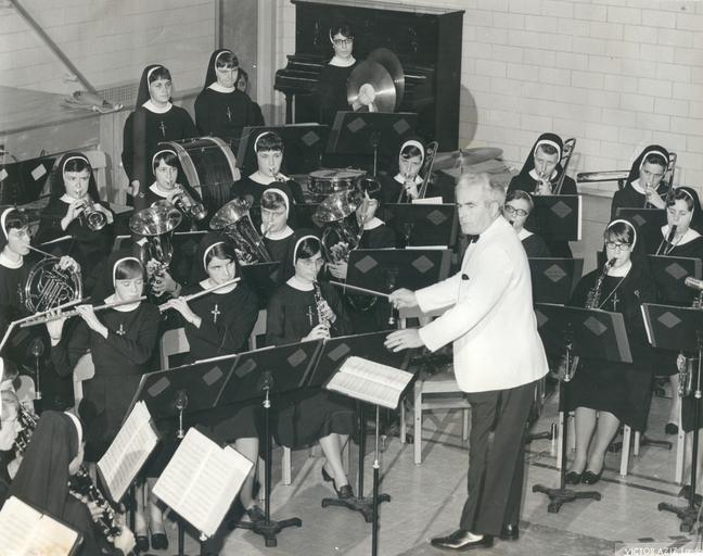 Keywords: Sisters of St. Joseph Concert Band with Martin Boundy conducting, London, Ontario. The Sisters of St. Joseph Concert Band began as part of the Centennial Program for the London based Sisters, which lasted from December 1968 until December 1969. However, the Concert Band lasted well beyond the Centennial year, and was quite successful, playing at ecumenical concerts, music festivals, and performance venues from Quebec City to Edmonton and many places in between. From March 1968 to June 1970, the Sisters of St. Joseph Concert Band performed in 15 cities, at 35 public concerts, traveled 8,000 miles and performed for over 23,000 people. Its conductor was the well-known and respected Mr. Martin Boundy, until 1971 when Mr. Donald H. Jones became the Band's conductor. The instruments first arrived on March 17, 1967, and the Sisters began practicing. Their first concert was on March 19 (St. Joseph's Day) in the Mount St. Joseph Academy Auditorium in London, Ontario. The Concert Band first officially performed at Catholic Central High School on March 15, 1968. On October 1 of the same year, they played at the Kiwanis Convention on the ground floor of Centennial Hall in London. Another significant performance included the 1968 Waterloo Instrumental Clinic on April 27, 1968, when they laid down their instruments and performed as a choir and received a standing ovation from their audience. Photo credit: Victor Aziz music bands concerts londonontario sistersofstjoseph