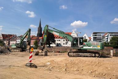 Keywords: site excavators construction work new ulm ulm danube island ulm cathedral münster steeple city city view
