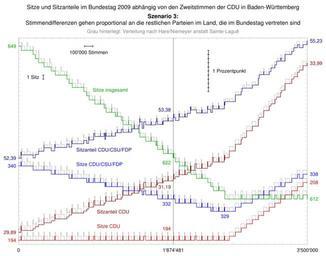 | Keywords: Sitze und Sitzanteile im Bundestag 2009 abhängig von den Zweitstimmen der CDU in Baden-Württemberg – Szenario 3.svg de Darstellung des hypothetischen Ergebnis der Bundestagswahl 2009 wenn die CDU in Baden-Württemberg weniger oder mehr Zweitstimmen bekommen hätte Szenario 3 Stimmendifferenzen gehen proportional gemäß ursprünglichem Stimmenanteil stets nach Sainte-Laguë verteilt an die restlichen Parteien im Land die im Bundestag vertreten sind FDP SPD Grüne Linke bzw kommen ebenso von ihnen Bei einem Patt werden halbe Sitze verteilt die im Fall der Oberverteilung in der Unterverteilung an das Land mit dem höchsten unerfüllten Sitzanspruch gehen nächste Höchstzahl bei Sainte-Laguë höchster verbleibender Bruchteil bei Hare/Niemeyer Kontext Negatives Stimmengewicht own …¡ …¦ …« 2010-01-15 File Sitze und Sitzanteile im Bundestag 2009 abhängig von den Zweitstimmen der CDU in Baden-Württemberg “ Szenario 1 svg File Sitze und Sitzanteile im Bundestag 2009 abhängig von den Zweitstimmen der CDU in Baden-Württemberg “ Szenario 2 svg Voting systems Bundestag elections |