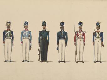 | Keywords: Six figures depicting military uniforms.jpg en 1 Madras Horse Artillery 2 Madras Light Cavalry 3 Madras Rifle Corps 4 Madras Pioneers 5 Madras Native Infantry 6 Foot Artillery One of a volume of thirty folios depicting castes occupations methods of cultivation and procession scenes circa 1830 made http //collections vam ac uk/item/O67346/painting-six-figures-depicting-military-uniforms/ Unknown production PD-Art Uploaded with UploadWizard Military uniforms of India | ||||