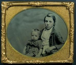 | Keywords: ambrotype ruby ambrotype rubyambrotype ruby glass collodion sixth-plate sixthplate omeka public domain publicdomain groupshot people photo border round outdoor This is the first example of a ruby ambrotype in my collection, a generous gift from an American friend who stayed for a night after we had both attended a course in early processes at Lacock Abbey. I'll use the comments below to show images and describe the characteristics of a ruby ambrotype, but in essence it's a traditional wet plate collodion positive (as devised by Frederick Scott Archer) but instead of being made on clear glass and then having a coat of black lacquer applied, it is on a very dark ruby coloured glass. Unknown provenance, unknown date (estimated late 1850s). What strikes me is the unusual yet very pleasing way that the photographer has dealt with the posing of the children (photographers always hate even numbers!). This is the first example of a ruby ambrotype in my collection, a generous gift from an American friend who stayed for a night after we had both attended a course in early processes at Lacock Abbey. I'll use the comments below to show images and describe the characteristics of a ruby ambrotype, but in essence it's a traditional wet plate collodion positive (as devised by Frederick Scott Archer) but instead of being made on clear glass and then having a coat of black lacquer applied, it is on a very dark ruby coloured glass. Unknown provenance, unknown date (estimated late 1850s). What strikes me is the unusual yet very pleasing way that the photographer has dealt with the posing of the children (photographers always hate even numbers!). |