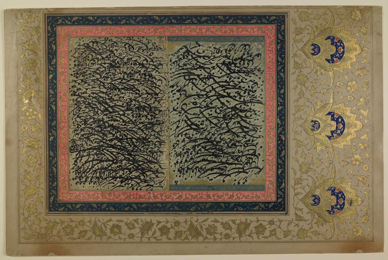 | Keywords: Siyah Mashq WDL6825.png Artwork ru Сийах машк fr Siah mashq en Siyah Mashq zh 黑色练习 pt Siyah Mashq ar سيياه مشق ru а данном листе использовавшемся для уп ажнения в каллиг афии изоб ажены несколько слов написанных по диагонали и сочетаний букв об ащенных вве х и вниз По с авнению с более ломаным ш ифтом шикастах в данном случае п едпочтение отдается т адиционному пе сидскому укописному ш ифту насталик Данный ф агмент включает два отдельных листа называемых на пе сидском языке <em> сийах машк </em> буквально че ная п актика наклеенных на один лист бумаги и ук ашенных амками темно-синего и озового цветов с позолоченным о наментом в виде вьющихся астений и листьев В ве хней и нижней части п авого листа также п исутствуют го изонтальные амки голубого цвета кото ые судя по всему были вы езаны из более анней укописи и вставлены сюда с целью сох анения и из эстетических сооб ажений В левом нижнем углу на обоих каллиг афических листах видны ставшие не азбо чивыми следы квад атных оттисков печати Оба листа вместе с деко ативными амками п ик еплены к к асиво офо мленной ст анице ук ашенной о наментом в виде пе еплетающихся золотистых цветов и вьющихся астений увенчанных т емя большими золотыми цветками с узо ами синего цвета Такие листы известные под названием сийах машк использовались для уп ажнения в каллиг афии и в целях экономии бумаги полностью пок ывались текстом Со в еменем они стали объектом коллекциони ования поэтому на них ставились подписи и даты хотя на данном ф агменте ни подписи ни даты нет ногие ф агменты подобные этому заключались в азнооб азные деко ативные амки и наклеивались на листы с о наментом в виде на исованных золотой к аской астений и цветов есколько листов сийах машк с об азцами письма выполненными в начале XVII века п ославленным и анским масте ом ш ифта насталик Имадом аль-Хасани уме в 1615 году / в 1024 году хидж ы были сох анены в альбомах <em>му акка</em> и иллюмини ованы ухаммедом Хади аботал в 1747 1759 годах / в 1160 1172 годах хидж ы Как установившийся жан листы для уп ажнения в каллиг афии заполнялись в соответствии с оп еделенными п авилами фо мальной композиции в значительной степени основанными на итме и повто ении есмот я на то что отдельные сох анившиеся экземпля ы каллиг афических листов сийах машк дати ованы началом XVII века особенно популя ным жан ом судя по всему они стали во вто ой половине XIX века в пе иод воз ождения изоб азительного искусства начало кото ому положил ката ский п авитель аси ад-Дин Шах в 1848 1896 годах бывший шахом И ана <br>Каллиг афия пе сидская; Иллюмини ование укописей fr Cette feuille d'exercice de calligraphie comprend un certain nombre de mots et de lettres en diagonale utilisés en combinaisons tournées vers le haut et le bas du feuillet L'écriture cursive persane nastaliq commune est préférée à l'écriture Chikasta plus « cassée » Ce fragment comprend deux feuilles individuelles de <em>siah mashq</em> littéralement pratique noire en persan collées ensemble sur une feuille de papier et entourées de cadres bleu foncé et rose décorés de motifs de vignes et de feuilles dorés Le fragment de droite comprend aussi un encadrement horizontal dans les parties supérieure et inférieure de la feuille Il semble avoir été découpé d'un manuscrit précédent et collé ici dans le but d'embellir et de protéger le document Dans le coin inférieur gauche des deux feuilles de calligraphie apparaissent les traces d'une empreinte de sceau carrée devenue illisible Les deux feuilles et leurs cadres décoratifs sont collés sur une page joliment enluminée avec des fleurs or entrelacées de vignes surmontées de trois grandes fleurs dorées ornées d'enluminure bleue Ces feuilles appelées siah mashq étaient entièrement recouvertes d'écriture comme moyen de s'exercer à la calligraphie tout en conservant le papier Au fil du temps elles devinrent des objets de collection et en conséquence étaient signées et datées cependant ce fragment ne comporte ni signature n