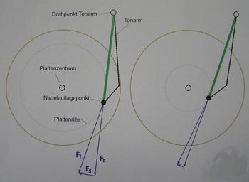 Keywords: Skating1.JPG Beschreibung Kräfteverteilung beim Skating-Effekt Quelle Selbst gezeichnet 2007/01 Ersteller Dieter Stotz 2007-02-09 own assumed Bulova~commonswiki Phonograph turntables Diagrams in German