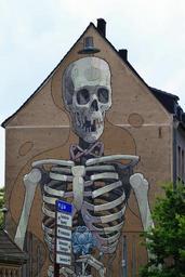 Keywords: skeleton frame bone skull and crossbones hauswand graffity art graffiti wall painting facade architecture home building housewife cologne