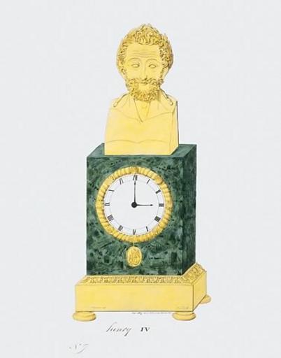 Keywords: Sketch of a French Empire style clock. King Henri IV.jpg en Watercolour and gouache over lithographic line on laid paper Inscribed Jeannest invt / Imprie Lithoie de C Motte rue des Marais Numbered 7 Dimensions 68 cm by 50 8 cm The design attributed to Louis-François Jeannest To be executed in gilt bronze and verde antiquo marble; silvered metal dial The king ™s bust probably after Barthélémy Prieur on a plinth fronted by the French chivalric Order of St Michael the collar of the order forming the bezel to the dial suspending its insignia a medallion of the saint overcoming the dragon The Jeannest who is credited with this design might be the early nineteenth century sculptor Louis-François Jeannest who was a leading member of the Association des Fabricants de Bronzes and besides exhibiting at the Paris Salons worked in association with bronziers Henri IV reigned 1589/94-1610 was the first king of the Bourbon dynasty in France Raised as a Huguenot he had to become Catholic in order to ascend the French throne famously commenting that ˜Paris is worth a Mass ™ Henri IV was the most popular of French kings and his cult was much in vogue towards the end of the 18th century As the Bourbons ™ founding father he was a natural symbol of legitimacy for the restoration of the Bourbons after the defeat of Napoleon in 1814-15 and his cult was rekindled to emphasize Louis XVIII ™s role as a reunifying bringer of peace and as a king close to his people Thus several clocks with the image of Henri who had also to struggle to ascend the throne date from the Restoration period The Ordre de Saint-Michel was founded by Louis XI on August 1 1469 Louis XI had a particular devotion to the saint but additionally St Michael with his imagery of vanquishing the Devil could serve as a useful allegory for the then recent expulsion of the English from France That allegory could now be freshly directed in the Restoration period to indicate the unseating of Napoleon The order ™s collar consisted of a repeated ˜S ™ interspersed with cockleshells the so-called cocquilles de Saint Michel as distinct from the cocquilles de Saint Jacques the pilgrims ™ emblem The medallion suspended from the chain shows the saint vanquishing the Devil in the form of a dragon The order was originally restricted to 36 members but this had become so relaxed that Louis XVI cut the numbers down to 100 in 1665 http //watercolours-drawings com/details asp subGalID 5 index 13 Louis-François Jeannest between 1815 1820 PD-Art French Empire style mantel clock Sketches |
