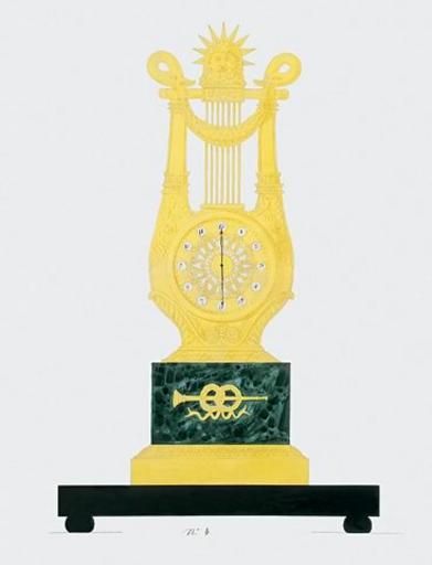 | Keywords: Sketch of a French Empire style lyre clock. Apollo.jpg en Watercolour gouache and pen and ink on laid paper Numbered 4 Dimensions 66 cm by 48 8 cm To be executed in gilt bronze and verde antiquo and black marble; enamel-set gilt bronze dial The clock contained within the base of the lyre which has swan terminals to its arms suspending a swag in front of the strings headed by a rayed Apollo mask; the plinth with trumpet and interlaced wreath mount; raised on black marble platform Apollo one of the twelve gods of Olympus the highest Pantheon in the Classical world embodied the Classical Greek spirit the rational noble and civilised as opposed to the passionate and licentious side of man ™s nature represented by Bacchus Apollo was identified with the Sun god Helios who daily traversed the sky in his golden chariot marking the passage of the sun and therefore an apposite subject for a clock besides the additional Bourbon association with the Sun King Louis XIV The lyre was the attribute of Apollo as the patron of the performing arts and leader of the Muses see cat 39 The swan was associated with Apollo as it was supposed to utter a beautiful song at its death chiming with Apollo ™s patronage of song The lyre was by the Restoration a long-standing and frequently used motif for clocks originating in the Régence but first gaining great popularity towards the close of Louis XVI ™s reign as attested by the series of Sèvres lyre clocks by Kinable and others http //watercolours-drawings com/details asp subGalID 5 index 9 author between 1815 1820 PD-Art French Empire style mantel clock Sketches |