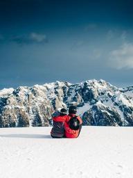 Keywords: skiing snowboarding couple love romance hugging snow mountains peaks sky outdoors nature landscape