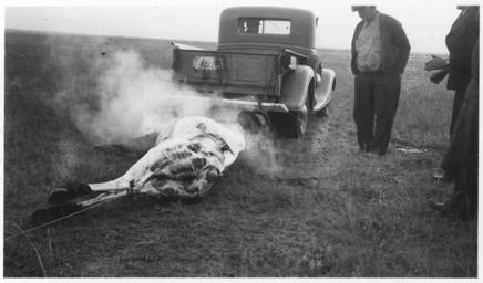 | Keywords: Skinning a buffalo the easy way - NARA - 285569.jpg Scope and content Accomplished by pulling the carcass between two cars but judged undesirable because it picks up a lot of dirt Pictures show pickup truck and carcass and men observing General notes 285569 Local identifier Department of the Interior Office of Indian Affairs Pine Ridge Agency 1878 - 09/17/1947 NARA's Central Plains Region Kansas City NREA 400 West Pershing Road Kansas City MO 64108 other date ~ 1945 Record group Record Group 75 Records of the Bureau of Indian Affairs 1793 - 1999 Record group ARC 404 Pine Ridge Agency Miscellaneous Photographs compiled 1923 - 1955 Series ARC 285545 File unit File unit ARC Variant control numbers NAIL Control Number NRE-75-PRSERIES215-2923 Other versions <gallery> File Skinning_a_buffalo_the_easy_way_-_NARA_-_285569 tif tif File Skinning_a_buffalo_the_easy_way_-_NARA_-_285569 jpg jpg </gallery> NARA-cooperation PD-USGov Buffalo butchering 1945 in the United States |