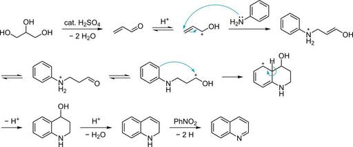 Keywords: Skraup quinoline synthesis mechanism.svg Reaction scheme of Skraup quinoline synthesis Own 2007-09-06 Calvero Skraup reaction
