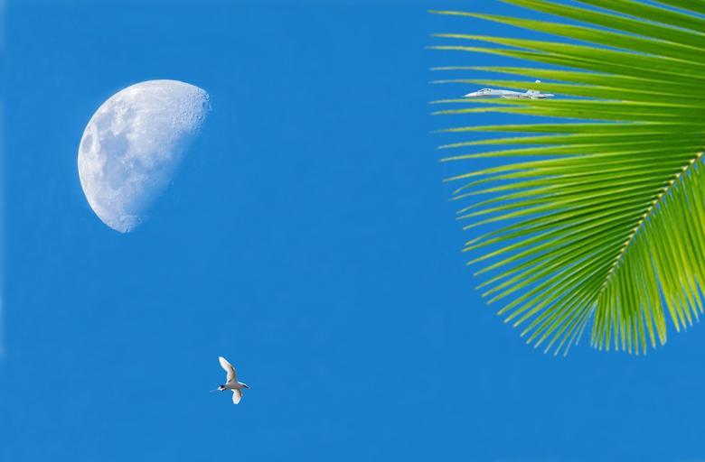 Keywords: sky blue sky tree nature moon astro natural satellite coconut tree leaves vegetation tropical plant environment flying seagulls tropical birds green landscape bird plane taking off light airport aviation take-off birds