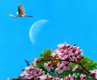 Keywords: sky blue sky tree flower branch peach blossom nature moon astro natural satellite coconut tree leaves vegetation tropical plant environment flying tropical birds green landscape bird heron