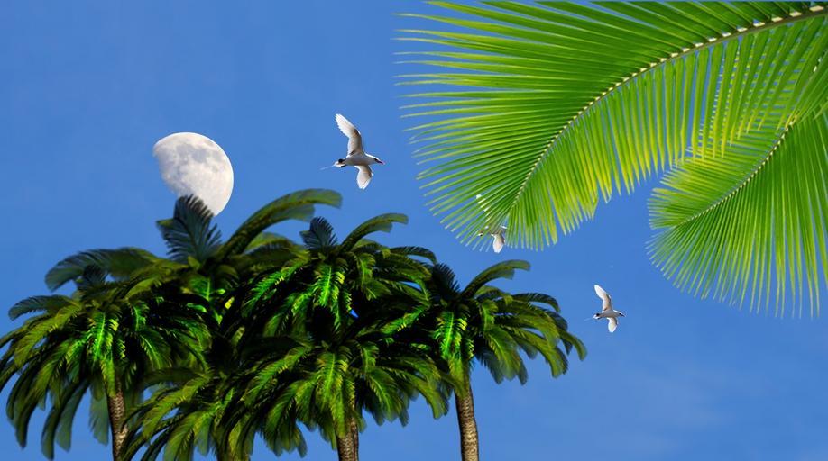 Keywords: sky blue sky tree nature moon astro natural satellite coconut tree leaves vegetation tropical plant environment flying seagulls tropical birds green landscape bird